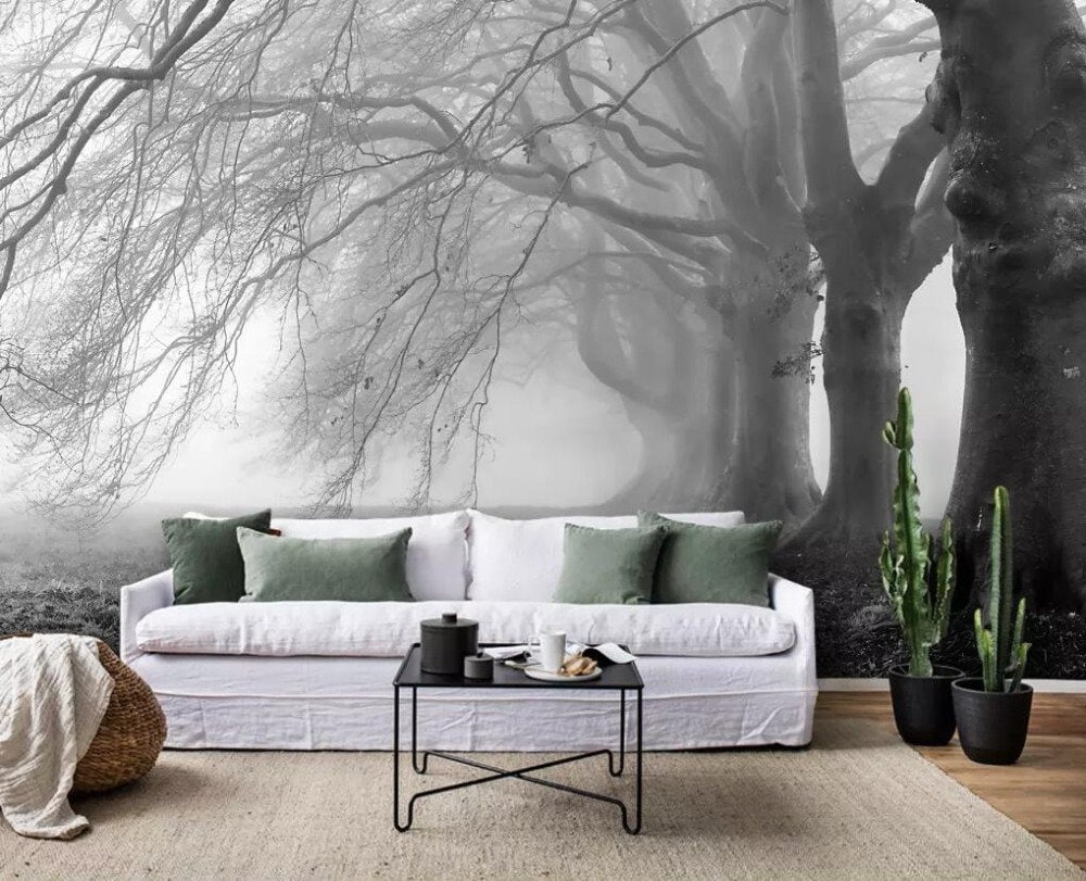Moderne Minimalistische Nostalgische Nebel Grau Baum Wald Etsy De